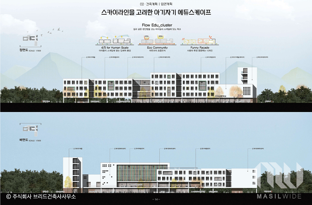 또한 주요도로(세병로)를 마주한 정문과 교사동 배치를 통해 학교의 존재감을 강조했으며, 교사영역과 주민개방영역을 명확히 구분하면서도 강당, 시청각실, 운동장 등 주민개방시설은 접근성과 편의성을 고려해 배치했다. 전반적인 조닝 계획은 교육환경을 극대화하고 지역사회와의 공유 가치를 함께 담아냈다는 평가다.